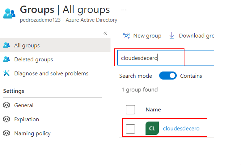 Para comprobar que se ha creado el grupo, vamos a Groups y En Search buscamos el grupo: