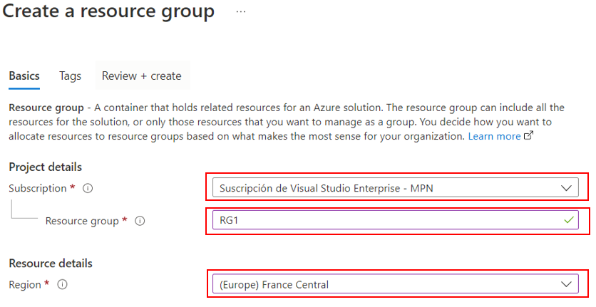 Importante, seleccionar la Suscripción donde crearemos el RG, el nombre del RG, y la Región ( Aquí seleccionamos la mas cercana a nuestra ubicación, para mejor latencia.)