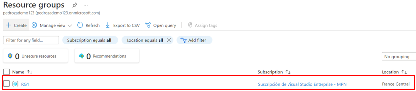 En el panel de Azure buscamos Resource groups (Grupo de Recursos):